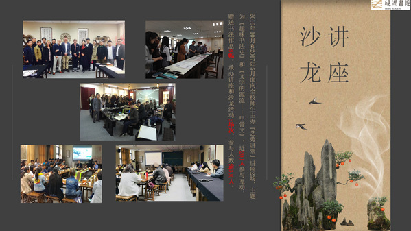 2.2016年10月和2017年5月面向全校师生开展“艺苑讲堂”讲座2场,主题为《趣味书法史》和《文字的源流——甲骨文》,近200人参与互动,赠送书法作品8幅。