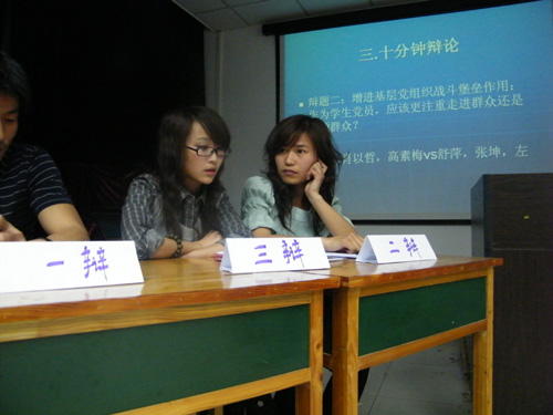 接着,同学们分别围绕“专业性发展和全面发展哪个更重要”、“党员走进群众和带领群众哪个更重要”话题展开辩论,从而更加深刻地了解到创建优良学风、促进全面发展以及增进基层党组织战斗堡垒作用的重要性。