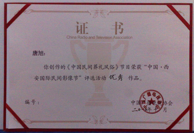 2010年10月16日,动画疯 广播电视艺术学专业的在校研究生唐旭,应“中国・西安国际民间影像节”评审委员会邀请抵达陕西西安参加本届国际民间影像节研讨会大赛,凭借其作品《中国民间葬礼风俗》,荣获“中国・西安国际民间影像节”评选活动“优秀作品”奖。