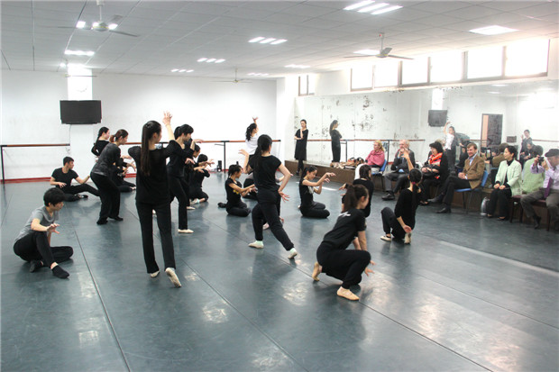 的舞蹈练功房, Lassmann院长一行还现场观看了音乐系本科生剧目排演课中音乐剧《猫》的片段排练,并与同学们进行了面对面的交流。来宾们对于动画疯