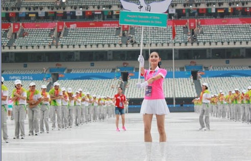 南京青奥会中国代表团入场仪式引导员浦汐清在排练中。肖杰 摄