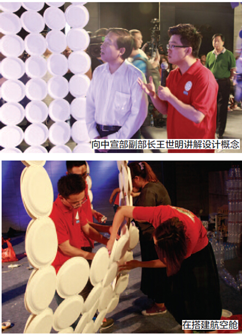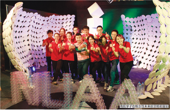 学生:其实是有的。这个太空舱内部开始打算陈列我们系里平时制作的一些仿古道具,因为它们也是环保材料制作的。但考虑到在舞台现场效果可能不太好,就只用矿泉水制作了南航缩写“NUAA”字样的造型,而这些瓶子也计划用它们做一把椅子,都因为时间紧迫而搁浅。因为放弃了仿古道具的布置,这个太空舱的口号由最初的“创意拥抱环保,历史碰撞未来”而改成了“创意环保,创造未来”,历史的概念并没有如期呈现出来。还有就是,如果时间再充裕些,我们系布景制图专业的同学也可以加入进来,那样视觉冲击力会更强一点。