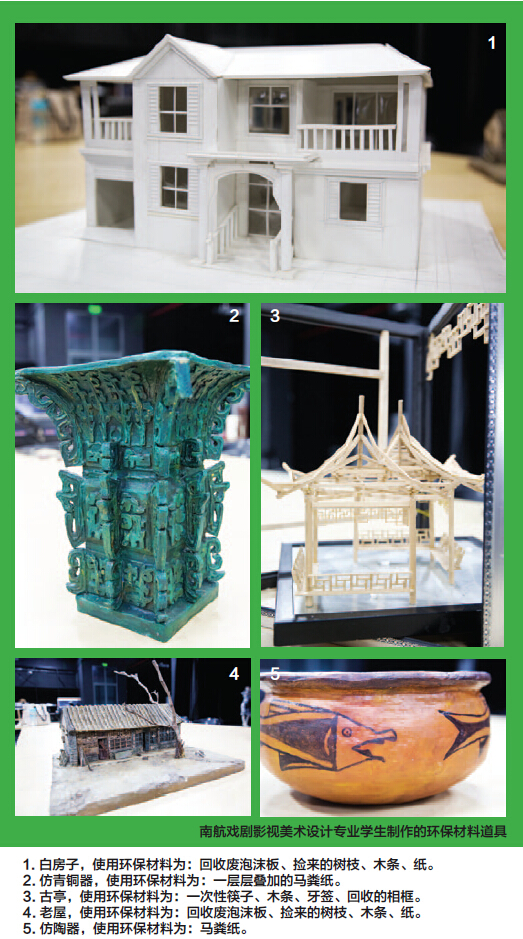 学生:是的。基本上都是马粪纸、回收来的一次纸木筷这些材料的再利用。因为戏剧影视美术设计专业在道具制作上需要尊重与还原历史,所以一般瓦罐这样的普通仿古道具的制作周期都要在一个月左右,大型的花费的时间则更长,才能保证较强的仿真系数。另外,后期的上色我们也是尽量选择环保颜料。