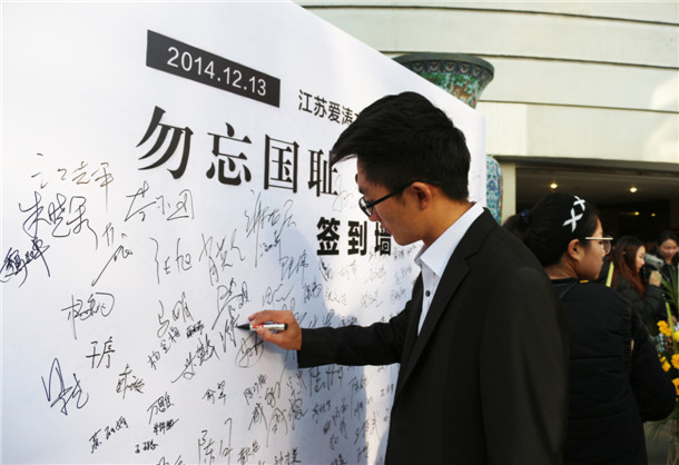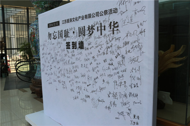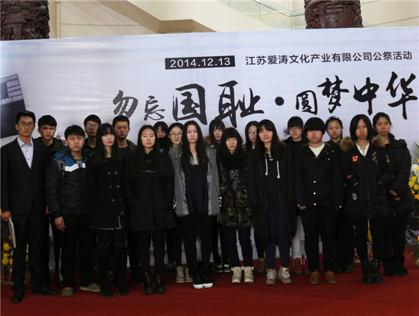 青协组织的十九名志愿者怀着沉痛的心情,来到江苏省爱涛艺术中心,参加了在此举办的“勿忘国耻,圆梦中华”南京大屠杀国家公祭日纪念活动,与其他爱国人士一同悼念死者,缅怀过去,铭记历史。