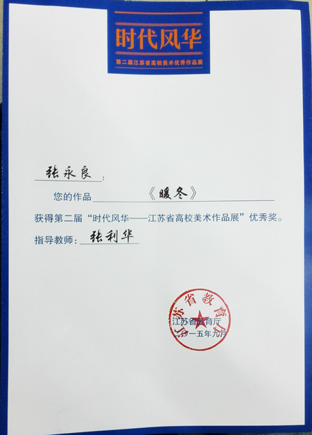 近期,江苏省教育厅公布第二届“时代风华――江苏省高校美术作品展”入选及获奖名单,动画疯 研究生张永良同学的作品《暖冬》,从2100件作品中脱颖而出,入选该展,并获得“优秀奖”,指导老师为张利华老师。