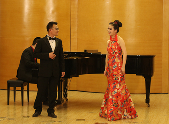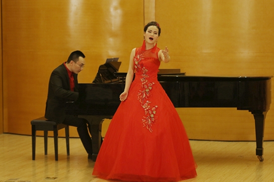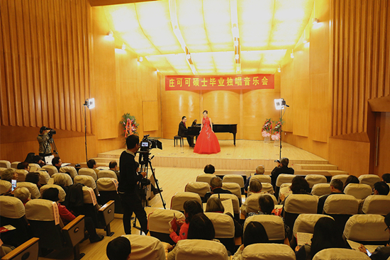 此次音乐会是庄可可对在读期间声乐演唱学习的一次总结和汇报,由导师宋宁邻教授担任音乐指导、詹航老师负责钢琴伴奏,全场共13首歌曲演唱。其中以选自歌剧《悲怆的黎明》中白云咏叹调的《深深的爱》开场,高昂优美的旋律点燃了整个音乐会的气氛。另外由庄可可同门师兄岳新生与可可共同演唱的湖南民歌《刘海砍樵》是一大亮点,其声情并茂的演唱风格获得了全场观众的热烈掌声。最后,庄可可以一首哈萨克族民歌《玛依拉变奏曲》为音乐会画上了圆满的句号。