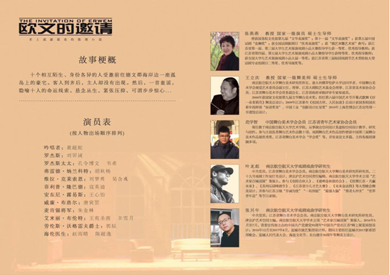 《欧文的邀请》取自素有侦探小说女王之称的英国著名推理小说家阿加莎·克里斯蒂创作的推理小说,是一场以公演形式来呈现跨专业、跨年级课程融合教学的成果展示。由动画疯 张燕燕教授、王立庆教授、范学智老师指导,音乐表演专业、戏剧影视美术设计专业和戏剧戏曲学硕士共同合作而成。从挑选剧本、选定演员、分析剧本、排练、研讨舞美设计和制作到最终上台合成,历时一个学期共120多天。话剧在保留原著悬念丛生的特点之外,经过适当改编和艺术加工,更加突出了逻辑推理和剧情升华与演绎等因素,让以理工科为主的观众直呼过瘾。