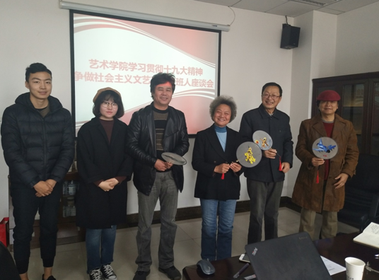 围绕学习贯彻十九大精神,座谈会专题学习了党的十九大报告关于坚定文化自信,推动社会主义文化繁荣兴盛的精神要求,以“争做社会主义文艺接班人”为主题。退休老教师王和芳、郎大地,以及在职教师张利华、陈启林等,结合自身在追求艺术事业道路上的人生经历和精彩故事,畅谈了对坚定文化自信的理解与认识,并就如何将理想信念落实到艺术创作和文艺工作中,如何树立正确的艺术观和价值观,以及如何在文化自信的大背景下肩负艺术使命,实现服务艺术事业和成就自身发展相结合等问题,和同学们进行了广泛深入和思想交流和引导。