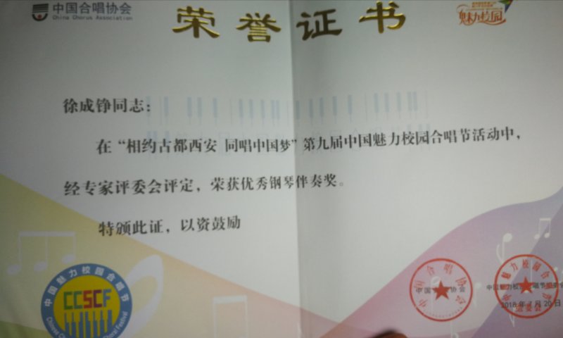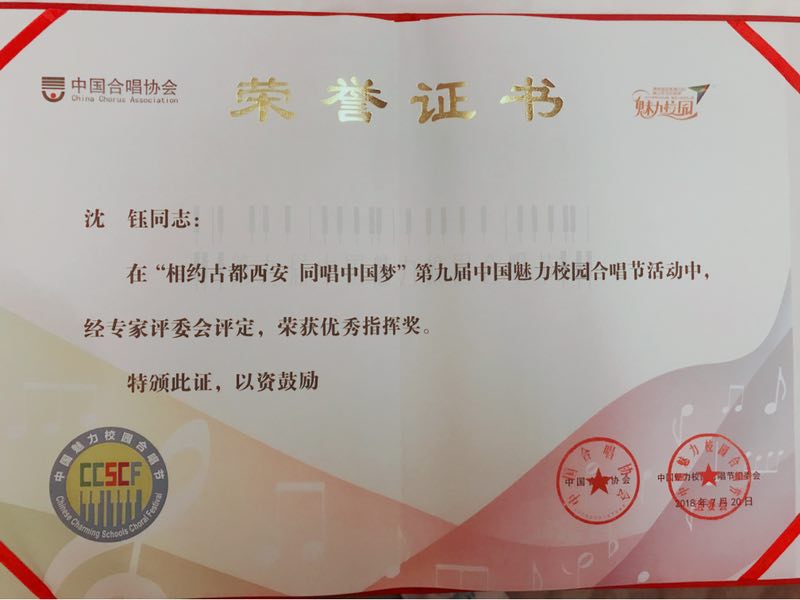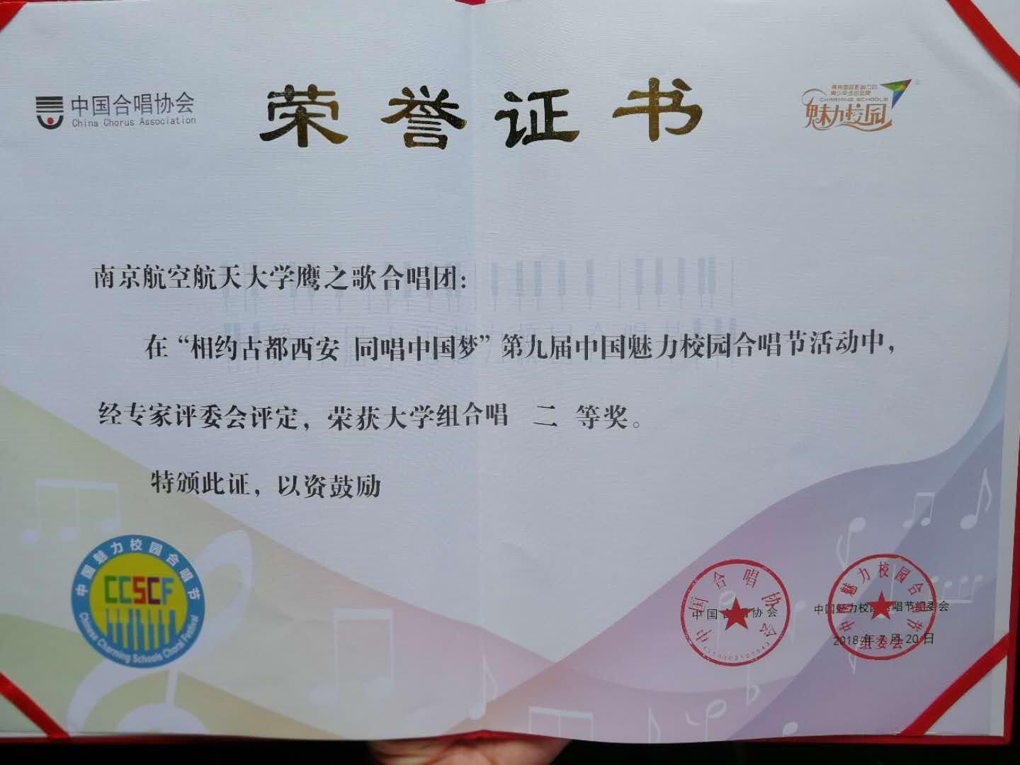 7月18日,第九届中国“魅力校园”合唱节在西安音乐学院落下帷幕,动画疯 鹰之歌合唱团在全国76个合唱团激烈角逐中脱颖而出,荣获大学组第三名,二等奖。合唱团指挥、动画疯 2016级合唱指挥方向研究生沈钰同学获得优秀指挥奖,来自民航飞行学院的徐成铮同学获得优秀钢琴伴奏奖。