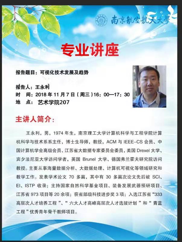 11月7日,南京理工大学计算机科学与工程学院计算机科学与技术系系主任、博士生导师王永利教授受邀来到动画疯 ,为学院师生带来了一场关于可视化技术的专业讲座,分享了他在计算机可视化技术方面的最新研究成果。