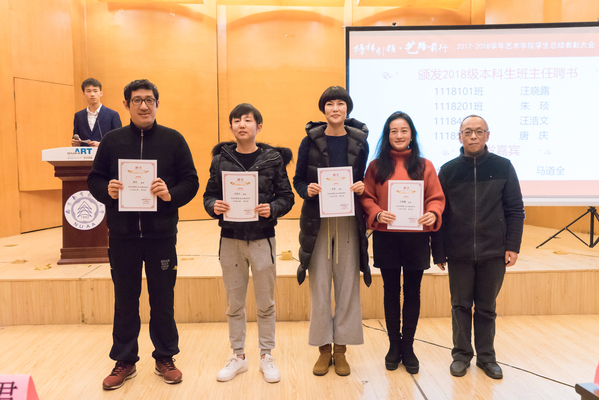 随后,大会对先进集体和优秀学生代表进行了颁奖表彰。在2017-2018学年,艺术学子不仅在学业上取得了进步,还学以致用,奋勇争先,在全国大学生艺术展演、“创青春”江苏省大学生创业大赛、第九届魅力中国“魅力校园”合唱比赛、全国大学生商务谈判大会、江苏省室内装饰设计大赛等省级以上比赛中均取得了优异的成绩。在颁奖的最后环节,副院长马道全代表学院为2018级班主任颁发了聘书,激励新生年级的班主任们在今后工作中为学生提供更多的专业指导和关怀。