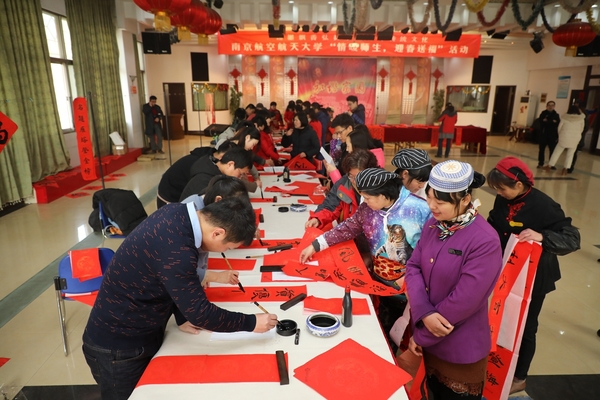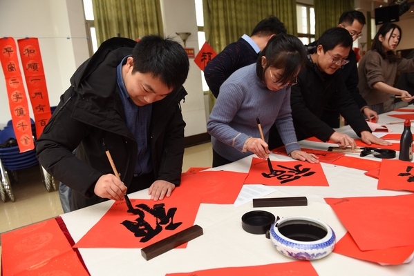 1月16日-17日,动画疯 书法专业师生和动画疯 老年书画研究会会员、砚湖书院学员等20余人,参加了由学校宣传部、校工会、动画疯 、离退休处联合主办的“翰墨飘香弘扬中华优秀传统文化”暨动画疯 “情暖师生,迎春送福”活动。在汉字的线条美与结构美之中传递出了浓郁的新春祝福,现场创作出上千幅春联、福字赠送给现场参与活动的师生员工与离退休老同志。