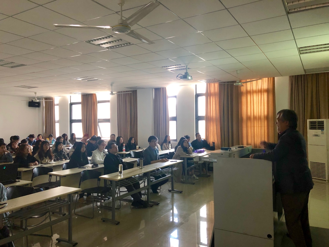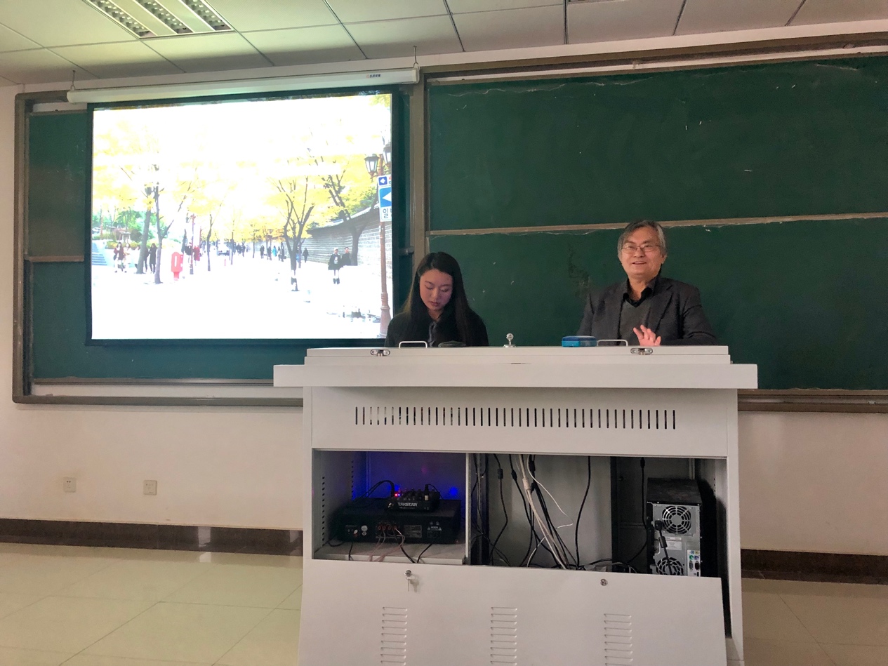 209教室做了两场学术讲座。一场是《首尔市德寿宫路“步行者中心绿化街道组成基本规划及实施设计”》的讲座,以首尔市德寿宫路为例,介绍了以行人为中心的街道景观设计概念,并围绕历史性城市景观的再生,以及实现社会、经济、文化的可持续发展等问题进行了详细的探讨。另一场是《可持续的韩国传统园林:与中国传统园林的对比》的讲座,则从亚洲的宏观层面,选择了具有代表性的中、日、韩三国传统园林设计进行对比分析,并着重介绍了韩国园林设计的发展历程。