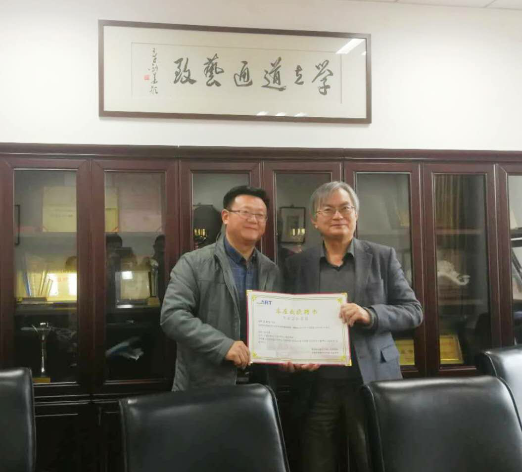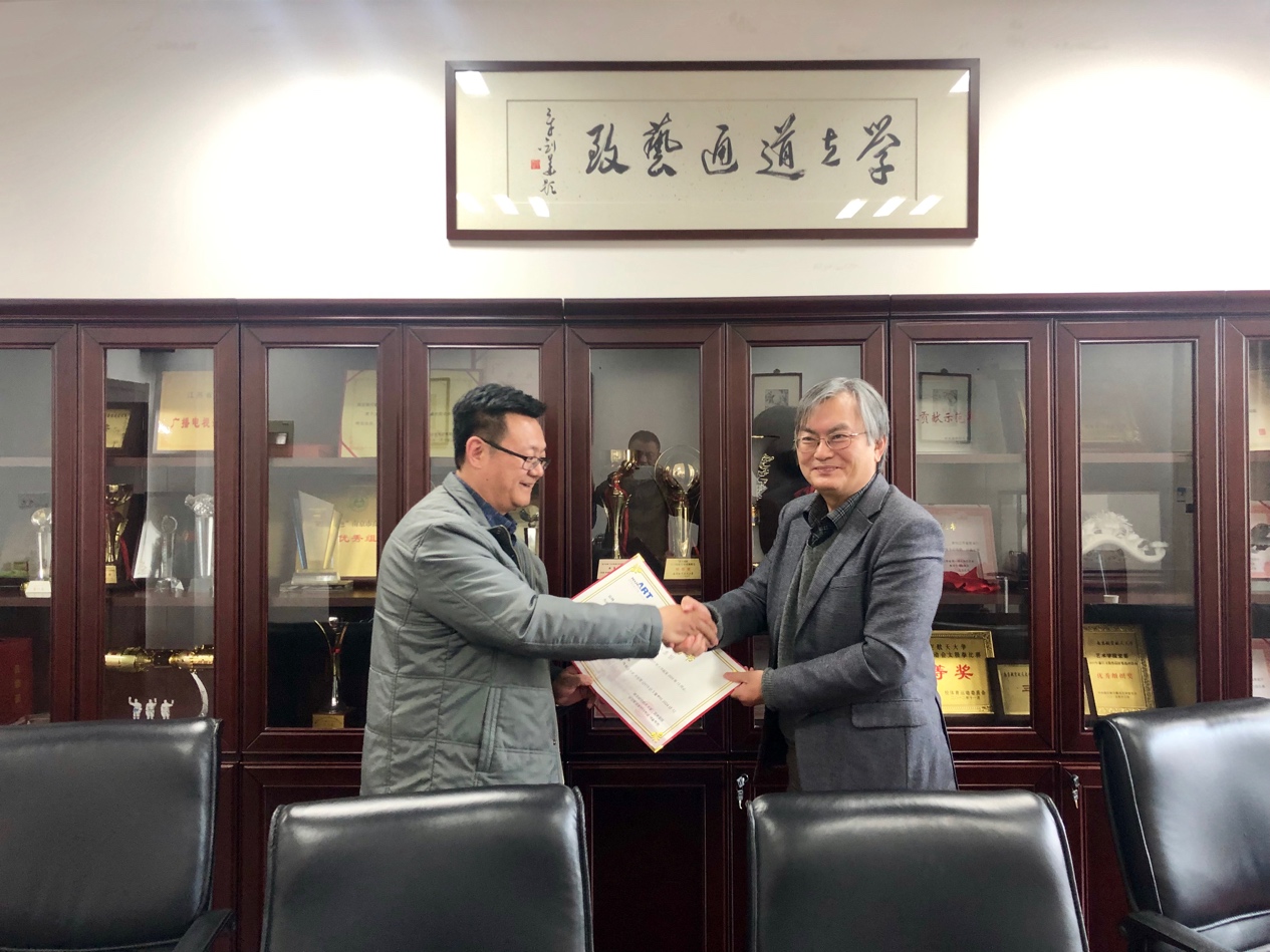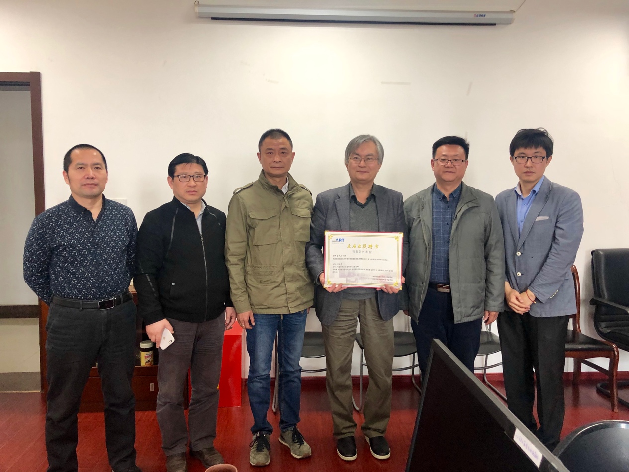 除此之外,金晟均教授还与动画疯 教师进行了座谈,为进一步促进两校师生间的国际交流达成多个层面的共识,其中包括以暑期交流,学期交流,学年交流为形式的学生层面的交流;以专题讲座、暑期课程、访学聘用等形式的教师层面的交流和共同参与课题研究及科研项目为形式的科研层面的交流。动画疯 教师的热情和良好的教学环境给金晟均教授留下了深刻印象,他欣然受聘为动画疯 客座教授,由板俊荣副院长代表学院为他颁发了“客座教授”荣誉聘书。