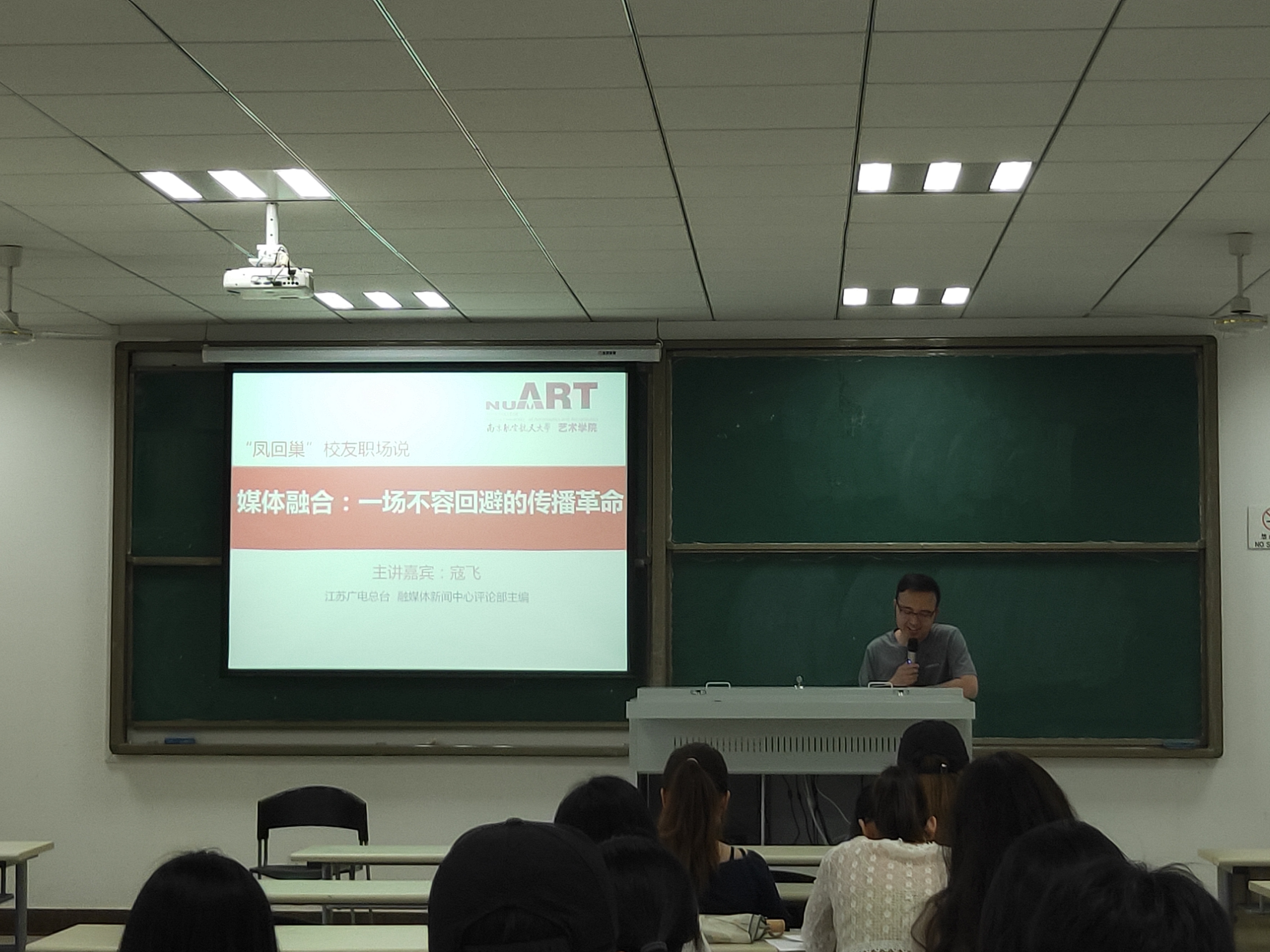 寇飞主要从媒体人的生存状态、新闻工作的党性原则以及全媒体时代对人才的要求三方面向同学们介绍了在媒体融合的趋势下相关专业学生努力的方向,引导同学们正确认识自身以便更好适应职场要求。谈到媒体发展现状,寇飞表示“当前各种媒体处于融合发展态势,互联网成为不可或缺的信息传播媒介,利用好新媒体这一武器是对媒体人最基本的要求。”同时他还提醒同学们在平时的学习中,不仅仅是要把片子剪好、文案写好,还要多关注时事,了解国家的大政方针。