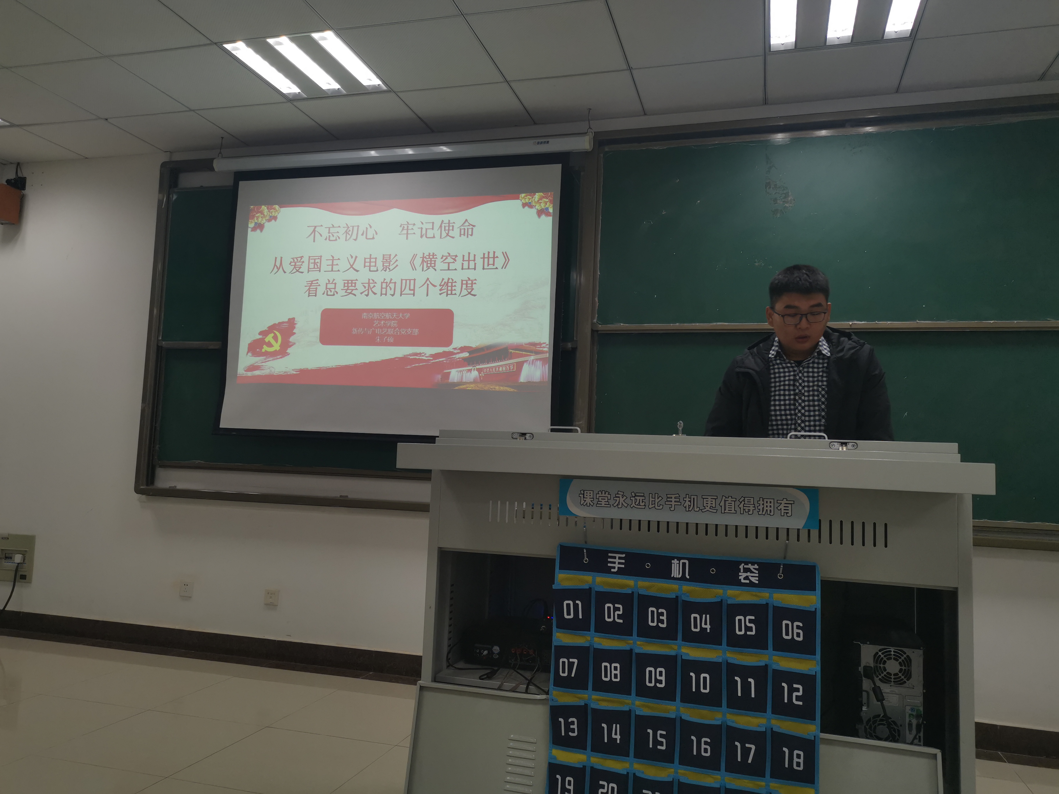 广播电视艺术学与新闻与传播联合学生党支部支部书记朱子硕从爱国主义电影《横空出世》为出发点,展开“不忘初心 、牢记使命 ”主题教育总要求的四个维度,即:守初心要“诚”、担使命要“勇”、找差距要“准”和抓落实要“狠”。朱子硕通过影视作品,向同学们生动地说明了了大国利器的重要性。