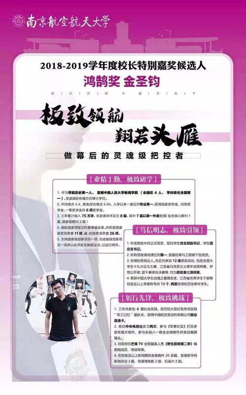 11项国家级奖项荣誉,26项省校级奖项荣誉,是他对极致的挑战,更是他对鸿鹄之志的追寻。鸿鹄之志;前途愈险,方显极致涵义。从成我到成人,从站在南航为时代发声,到站在全国的平台为时代助力,金圣钧拥有了笔走龙蛇的文字和洞察世情的眼光,明确了自己的责任就是弘扬人间正气,传播时代之音。