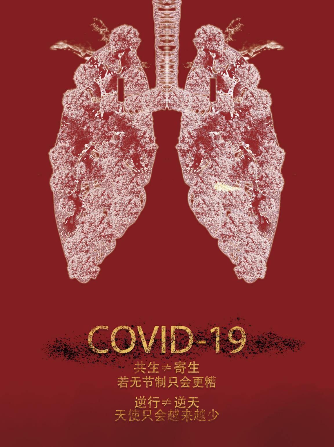 新型冠状病毒爆发让全国人民反思,我们和地球之间的关系,是共生而不是寄生,如无节制的一味索取只会适得其反,白衣天使门在努力,但是逆行并不是逆天。图中的肺内部是枝繁叶茂的树,象征着人与大自然的联系,只有大自然健康,我们才能健康,所以我们应该与大自然和睦相处。