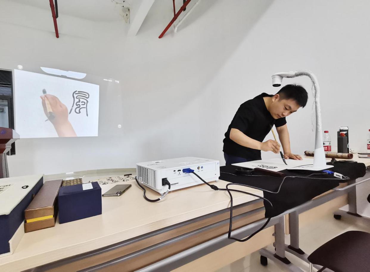 开班仪式后,动画疯 青年教师郭洪豹带来了一堂精彩的书法课。首先他梳理了在书法书法基础知识,解答了在书法学习过程中常遇到的问题,同时现场书写演示“篆、隶、草、行、楷”5种字体的发展过程,并深入剖析各种字体的不同特点,带领学员们赏析不同字体书法原作,为学员们选择入门法帖提供了参考。课程的后半部分,郭老师详细讲授了笔墨纸砚的选择技巧以及文房四宝的使用和保养的方法,并在现场挥毫泼墨,直观的展示了书法创作的完整过程。
