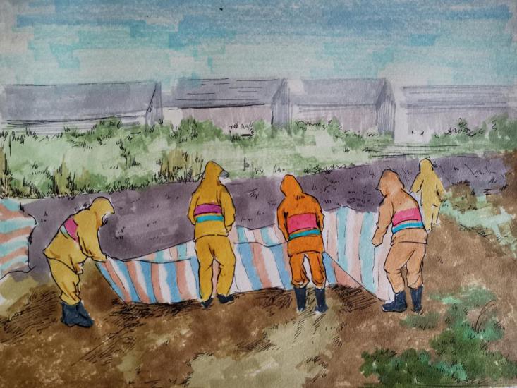“作为大学生,我们虽然无法亲自加入一线救援队伍,却也能在后方投身抗洪宣传工作,为奋斗一线的防汛人员记录下他们防汛的最美身姿,用画笔传达笔尖上的防汛精神。”称自己是北方小孩的黄雅洁说道:“我没有经历过洪涝灾害,对洪涝带来的损失和灾难是很震惊的,也为抗洪人员的坚定所动容,因此想用一技之长展现对一线抗洪人员的敬意。”