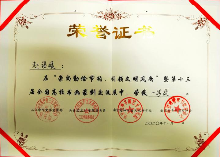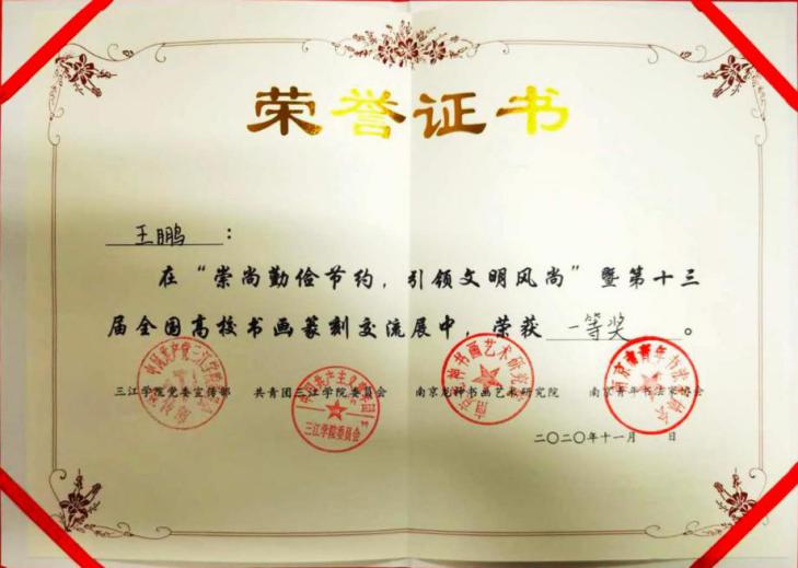 2020年11月4日,第十三届全国高校书画篆刻交流展在三江学院图书馆开展。此次展览,由共青团三江学院委员会主办,三江学院书画协会承办,驻宁高校书画协会联盟、三江学院党委宣传部、三江学院图书馆协办,由南京龙神书画艺术研究院和南京青年书法家协会为支持单位,展览时间为11月4日—11月10日。开展当日,汇聚了全国七省38所高校的作品,包括书法作品88副及绘画作品近百副,得到了龙神书画艺术研究院、中国书法家园网、南京市青年书法家协会以及南京林业大学、南京信息工程大学、长春建筑学院、东北大学、河北地质大学、阜阳师范大学、重庆师范大学、南京财经大学、动画疯 、南京师范大学、南京邮电大学等单位和高校支持,经过评委老师现场评审和打分,动画疯 动画疯 邱世鸿教授的两名研究生王鹏、赵锡媛,均荣获一等奖。