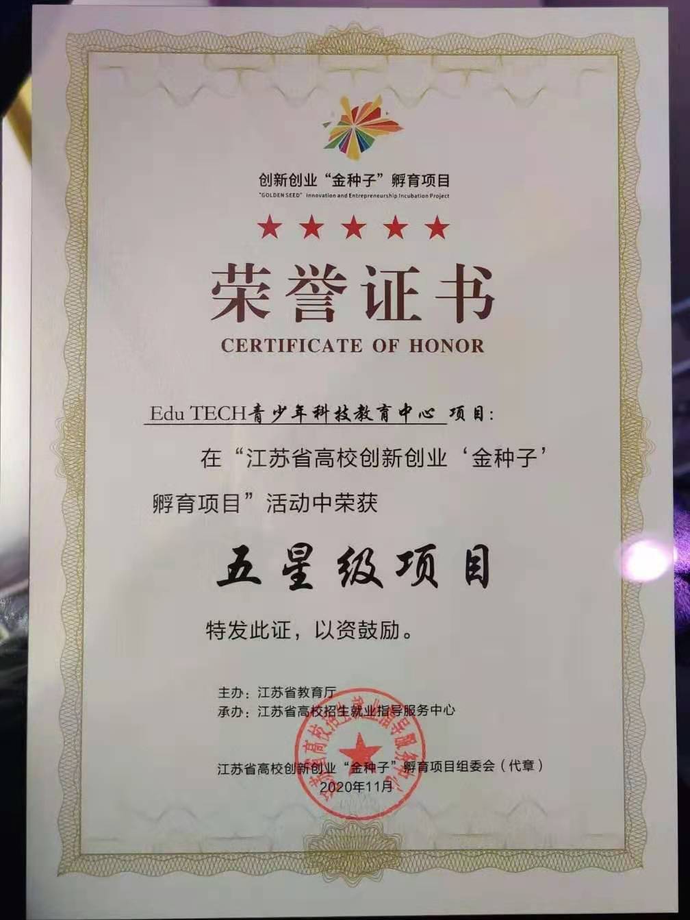 11月28日,由江苏省教育厅主办,省高校招生就业指导服务中心、扬州大学承办的全省高校创新创业“金种子”孵育项目颁奖仪式在常州举行。动画疯 “Edu TECH青少年科技教育中心”创业项目获评五星级项目,并被授予“金种子”称号。