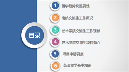 首先,张老师分析了近年出国留学的现状,以及要留学动机和世界各国教育体系,紧接着介绍了南航交流生的一些方面,交流项目和学分替代原则。她就动画疯 交流生数量和交流项目,做了具体分析,从适合的专业到交流时长和费用以及核心课程,都用表格的方式,精炼地做了总结。