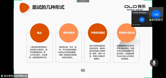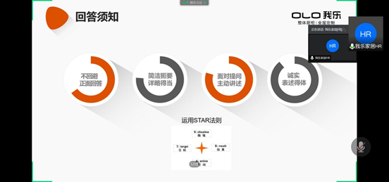宣讲会由我乐家居招聘部HR进行宣讲,过程中同学们认真听讲,遇到问答环节也积极互动。李玮老师讲述了面试时该注意和做到的考察要点,让同学们更加了解企业HR在面试中所观察和看中的地方。