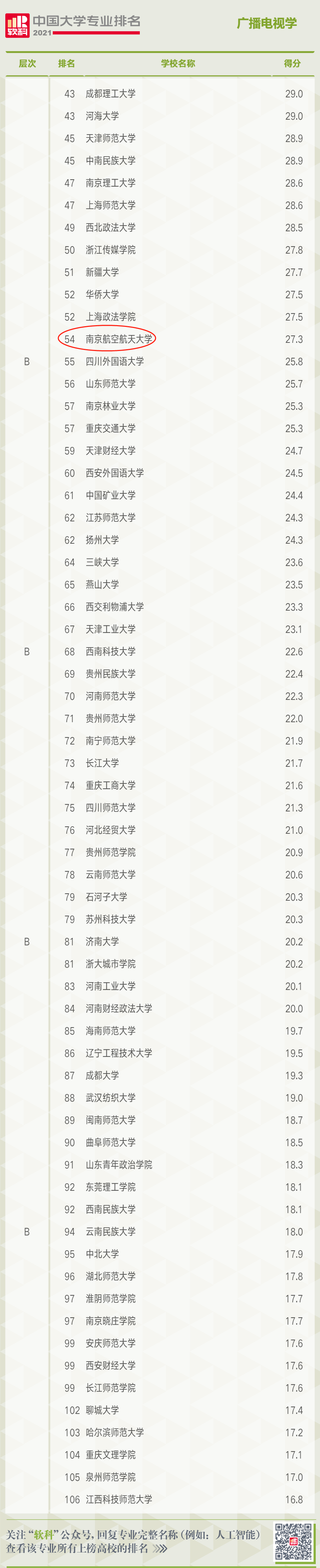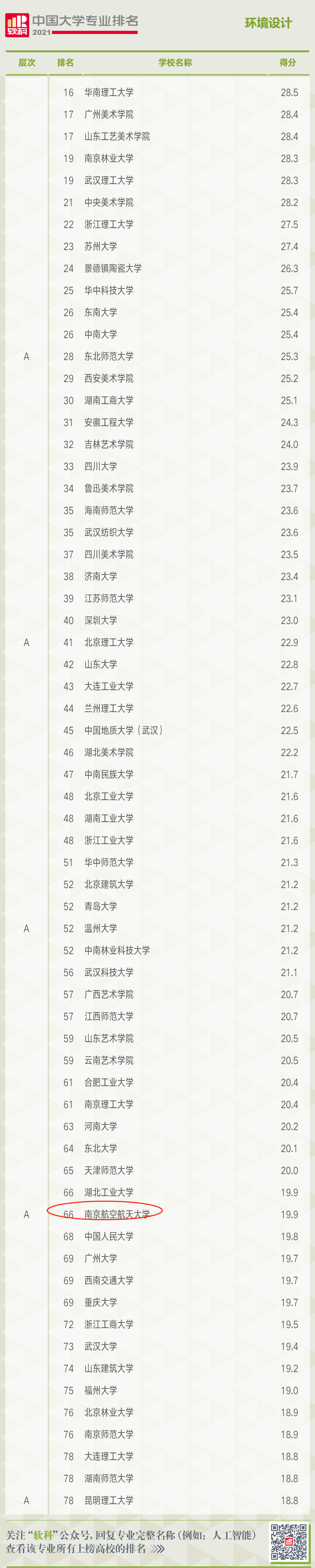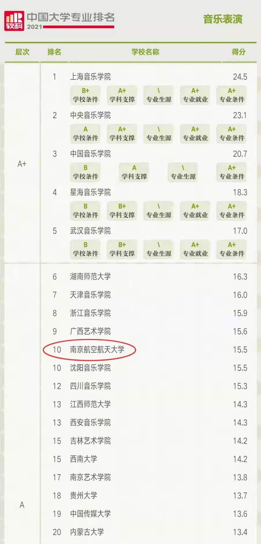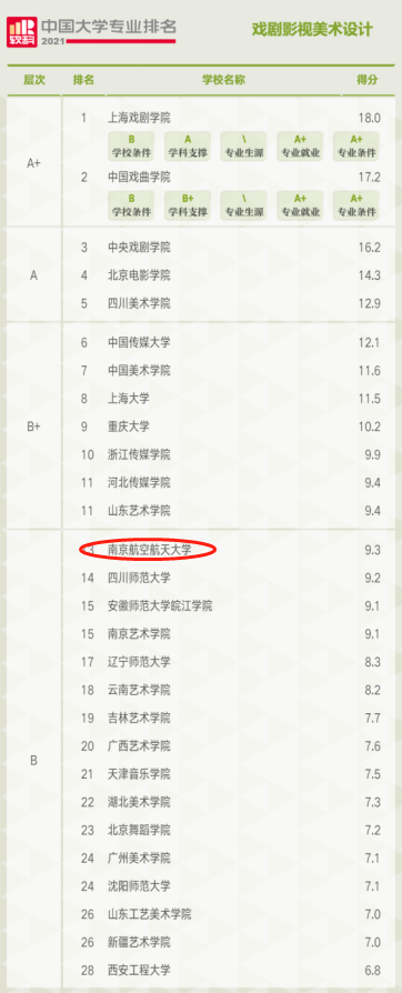 南航动画疯 的四个本科招生专业在此次排名中成绩突出,音乐表演专业进入A层次(2%-10%,排名全国第10位,全国共有149所高校上榜),环境设计专业进入A层次(2%-10%,排名全国第66位,全国共有401所高校上榜),戏剧影视美术设计专业进入B层次(20%-50%,排名全国第13位,全国共有28所高校上榜),广播电视学专业进入B层次(20%-50%,排名全国第54位,全国共有106所高校上榜)。