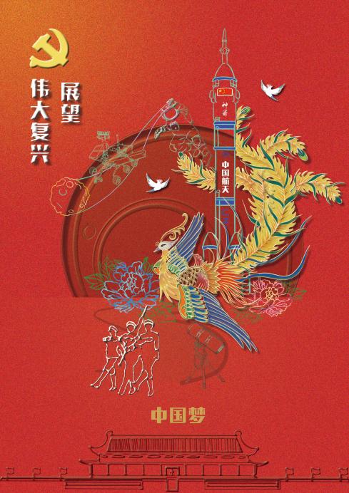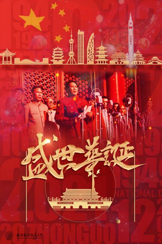 海报展现了开国大典上的经典画面,配以五星红旗、城市剖面、航天飞船、天安门等元素,表现了对国家强大、城市繁荣、航天发展的赞叹与信心,表达了青年学子对国家强大愿望的美好憧憬。