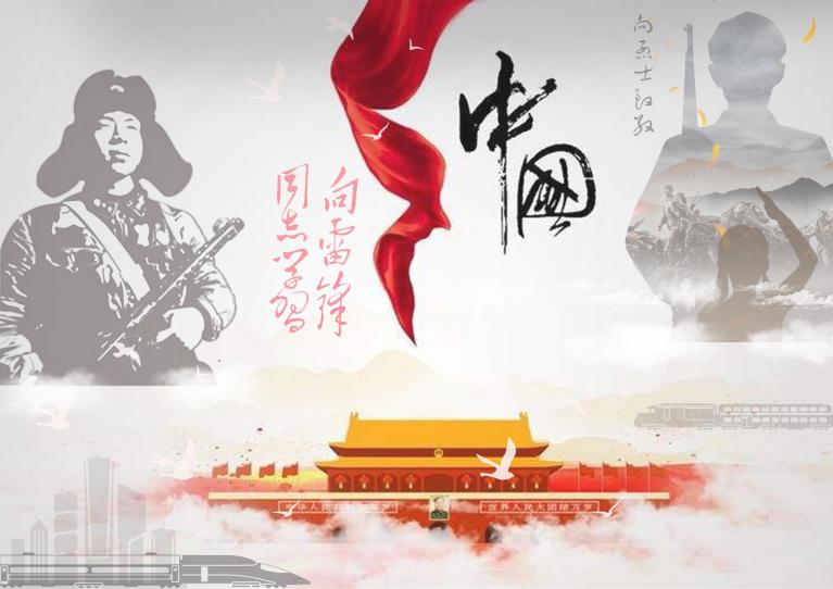 国旗和天安门、鲜艳的红色与黄色是祖国的象征。雷锋与爱国烈士的剪影,代表了满怀热血,无私奉献的英雄。列车、高楼和平鸽,寓意着革命先烈的英勇牺牲,才有如今的和平生活。