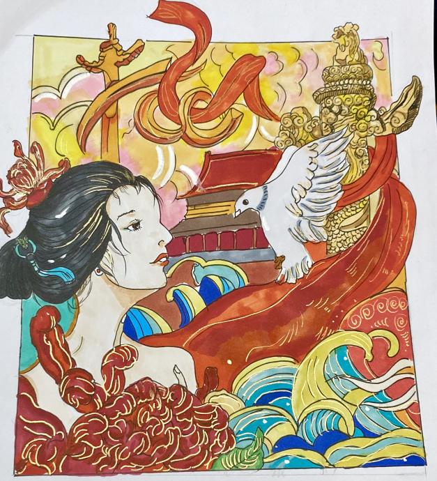 天安门与白鸽,让人联想到升国旗的场景。红色与黄色,是中国的颜色,代表着炎黄子孙。画中的古装女子,代表着中华上下五千年的民族历史。