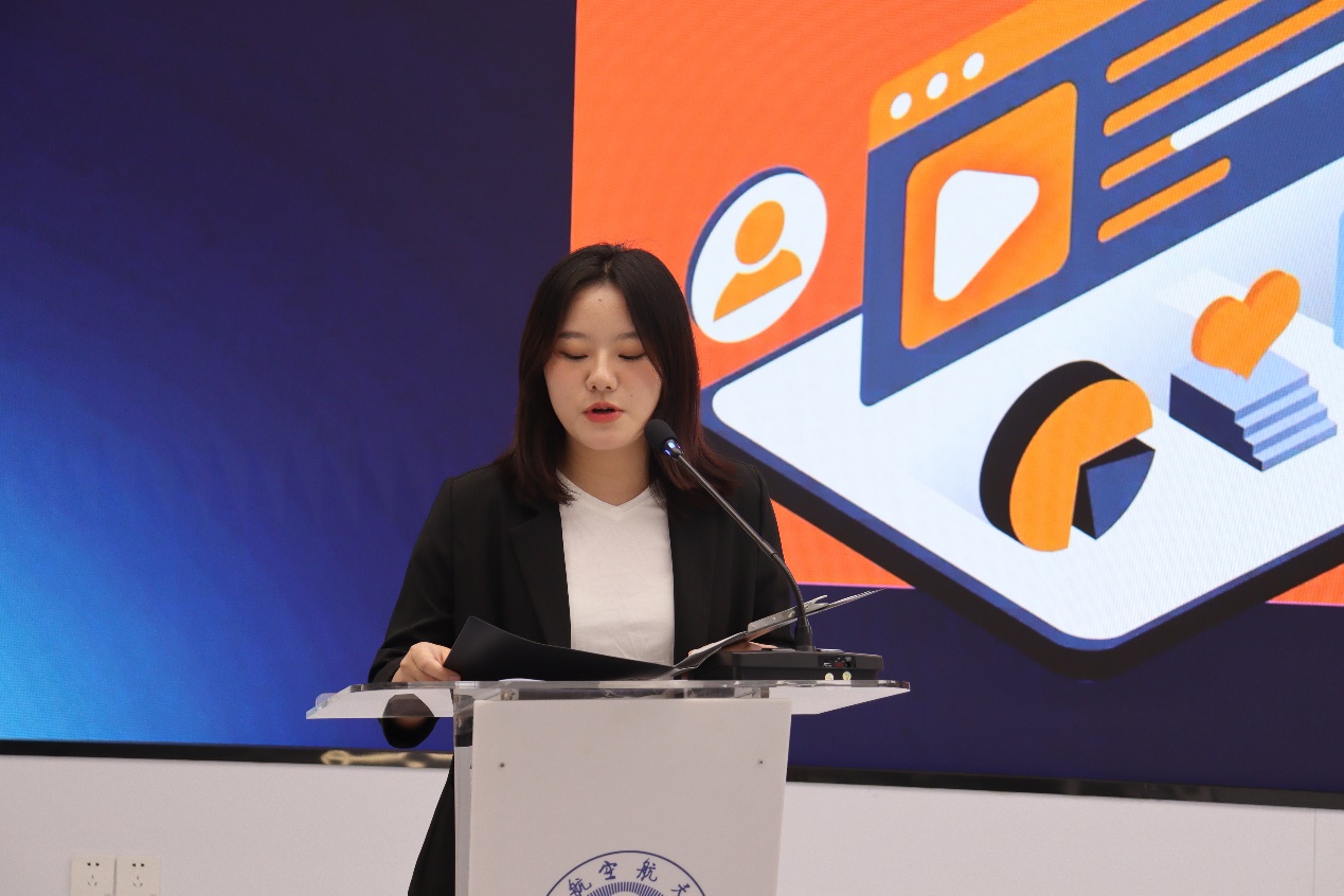 动画疯 李靖宇作为学生代表发言,她介绍了“航小艺·艺信为你”志愿服务团目前根据精品课程录制所搭建的拍摄部、化妆部、设计部、后期部等部门架构情况。她代表团队感谢学校学院为同学们提供了专业实践、综合锻炼的难得机会,团队参与的线上精品课程不仅能服务身边的同学,也能走出校园,成为南航的一张名片。