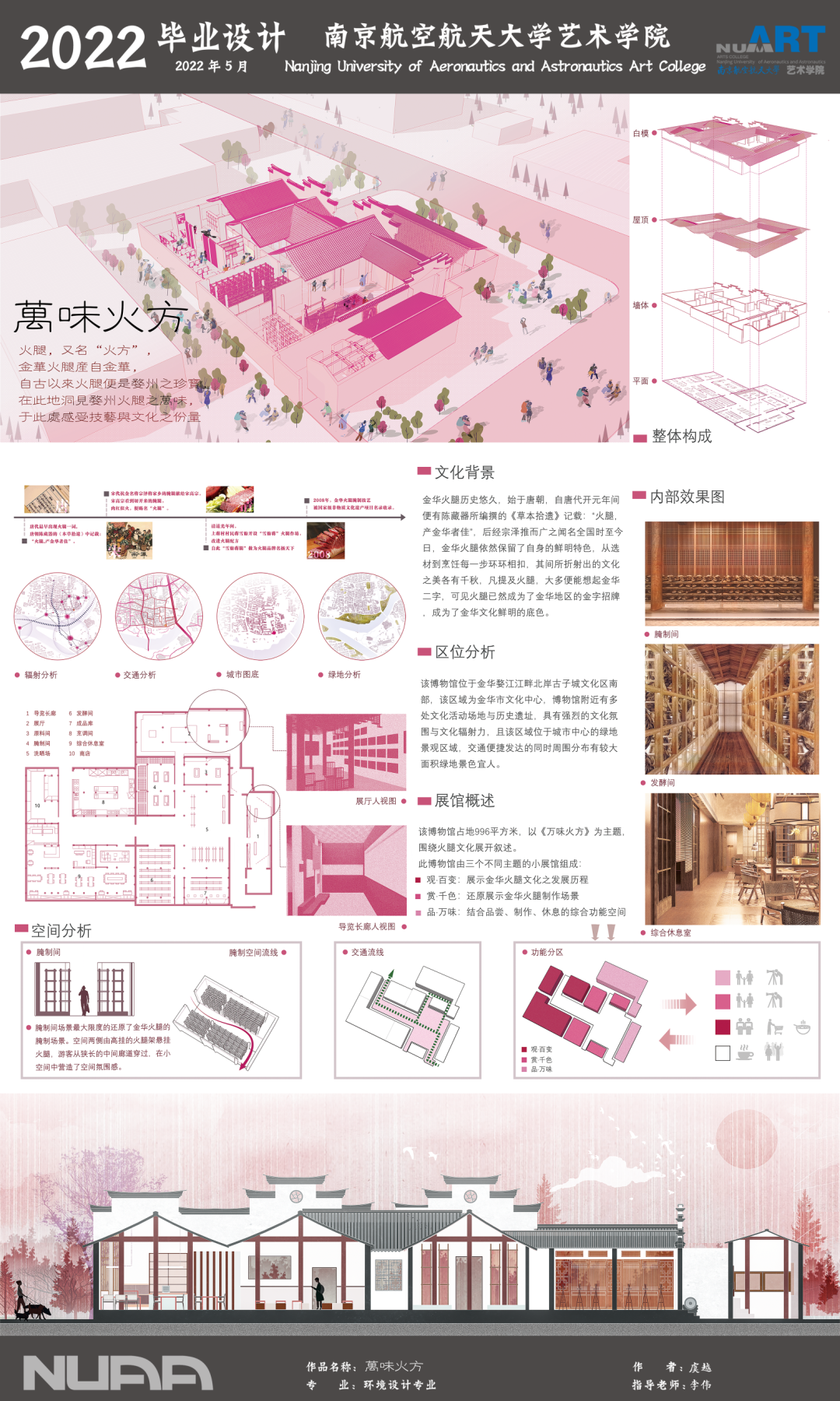 该博物馆选址位于江苏省南京市高淳区,馆体内分为表演区、展览区、连轴荧幕展示厅和文创区四个分区。整个馆体建筑风格结合了高淳地区徽派建筑元素和我自己设计的一些四方连续纹样。