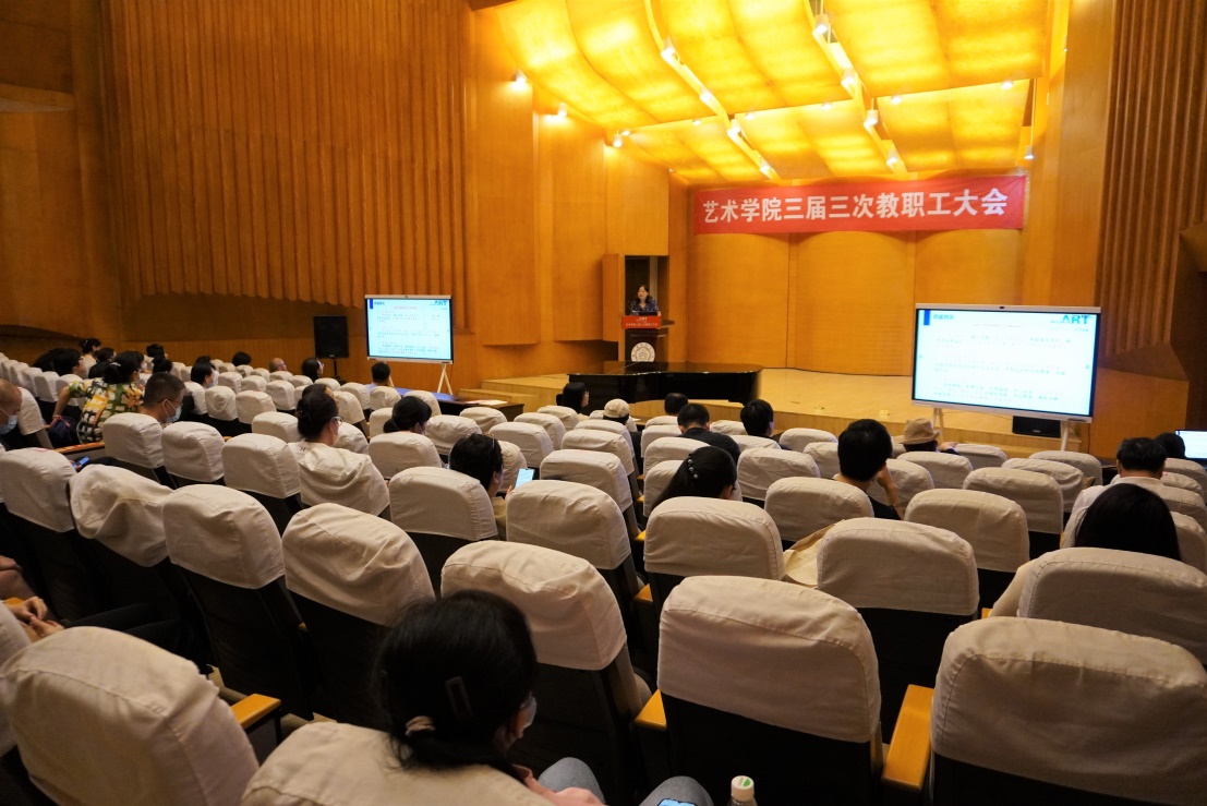 院长板俊荣对照学校、学院“十四五”发展规划目标和年度指标任务,向全院教职工传达了校党委副书记、校长单忠德所做工作报告、校党委书记郑永安总结讲话的主要精神。对学院当前面临的形式作了具体分析,并从党建引领、学科建设、师资引聘、国际交流、疫情防控、安全稳定等15个方面,全面规划了学院下半年的主要工作要点。他指出,全院教职工要毫不放松抓好疫情防控,坚决维护校园安全,牢牢把握立德树人根本任务,秉持认真负责、恪尽职守的态度,积极投入到新学期教育教学工作中。特别是加快推进国家级、省级特色专业内涵建设,完成学科整合,做好新学期学科申报的准备工作。他提出,在配合学校做好校庆70周年的同时,遵循学校节俭办校庆的工作思路,坚持党建引领,围绕学院专业和学科建设,加强学院制度建设。全力打造“艺工融合 双向驱动”的发展路径,为校庆70周年、学院20周年等系列工作夯实基础。