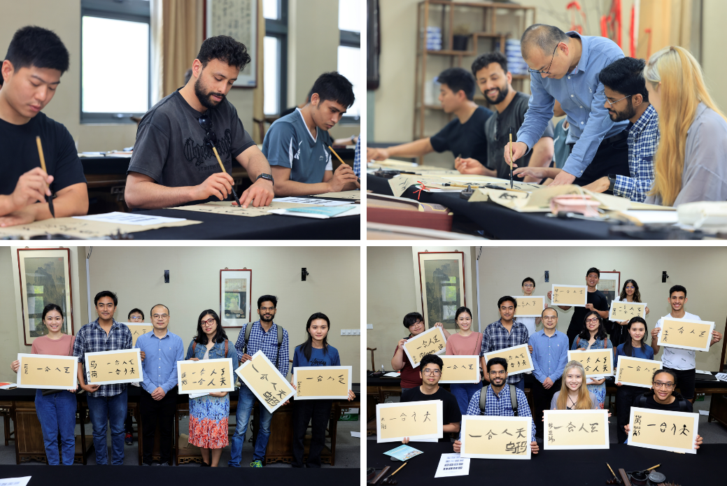汉字的发展绵延千年,但古字的韵味悠长不散。在课堂上,张老师首先展示并指导国际教育学院的学生们用三指法握毛笔,然后指导同学们如何书写古字。一点一撇一捺,随着“人”“合”等象形字跃然于宣纸上,留学生学员们们相互交流书法、创作书法,课堂氛围活跃。