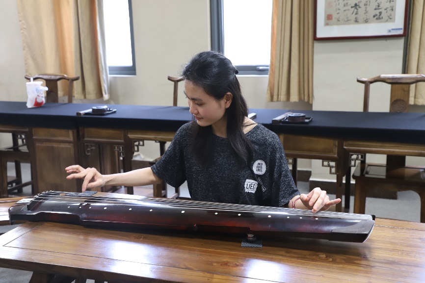 “我是来自印度尼西亚的SINTA ZHENG,目前是研二的一名学生,在这堂中国传统文化课上,“古琴”这种非凡的乐器唤起了人们的情感。古琴被誉为“先贤之琴”,具有深厚的历史渊源和灵性。它梦幻般的旋律和细腻的音调在内心深处回荡,营造出敬畏与宁静的独特融合。