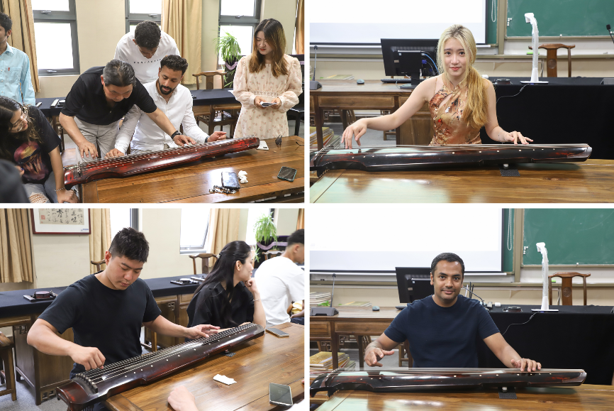 留学生们跟学着卞老师的指法,右手拨弹琴弦,左手按弦取音,试着弹奏古琴曲《平沙落雁》,感受指尖与琴弦的触动。真应了那句古诗“五音六律十三徽,龙吟鹤响思庖羲。一弹流水一弹月,水月风生松树枝。”