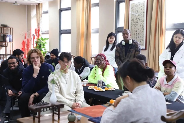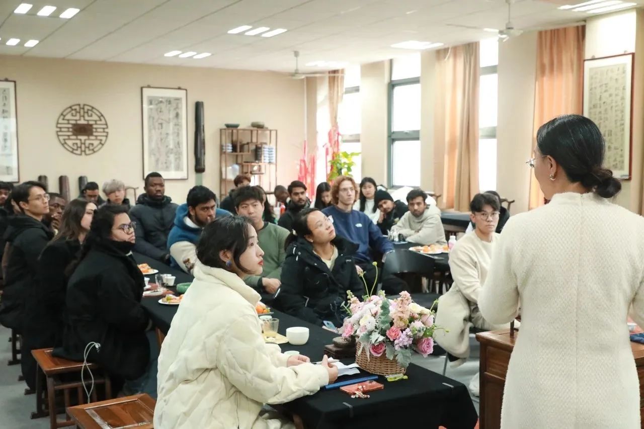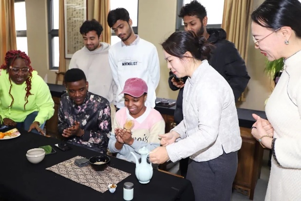 理论知识讲解结束后,余辉老师现场为留学生们表演宋代点茶并邀请同学们亲身体验。