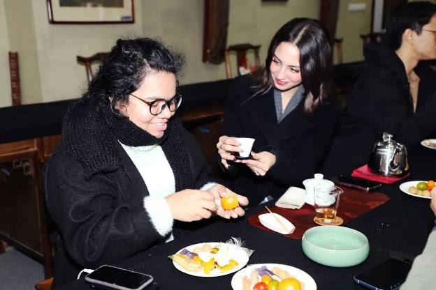 等待茶水冲泡的时间,郭老师向留学生们讲解了中国茶文化礼仪中扣手礼与揖礼。“如果是长辈给自己倒茶,可以半握拳,拇指内收,在桌上轻敲三下以示感谢……”最后,大家现学现卖,与老师揖礼告别。