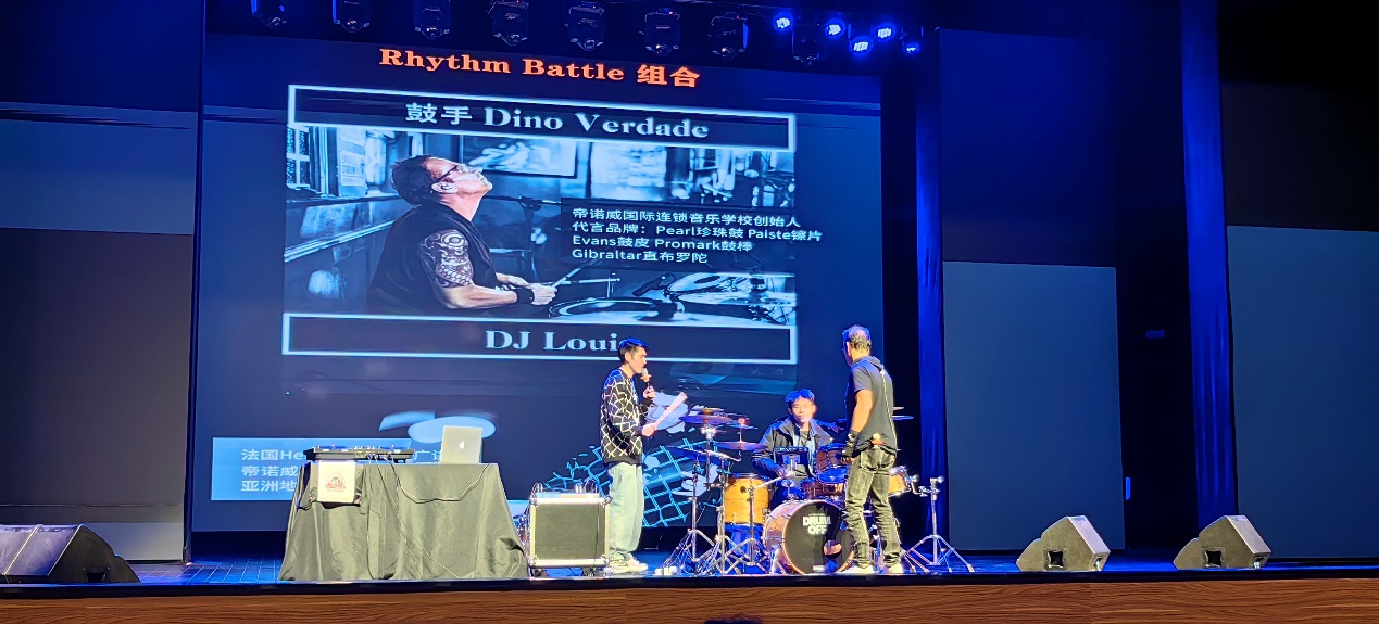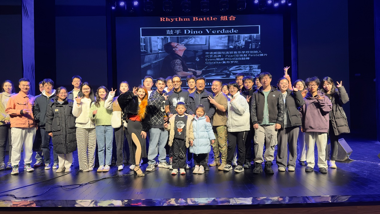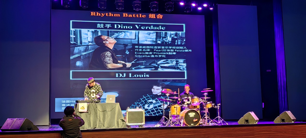 Rythem Battle组合是两位跨国音乐人的完美组合,基于鼓手各种节奏和搓碟表演,且有不同音乐风格的完美切换,现场表演氛围绝佳,表演的互动感极强。混音播放加上鼓手的独奏技巧展示,有合作也有竞技,形式新颖,观众的带入极强。在演出中,两位演奏者激情四射,他们以讲述和表演相结合的方式为观众分享了南美的桑巴、波西诺瓦、瓦列杜鲁、马拉卡斯等多种音乐风格。演出期间,还邀请了现场同学上台合作表演。