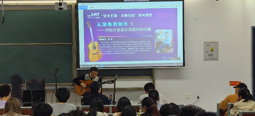 互动活动开始,湛辉为同学们弹奏了《爱的罗曼史》《加州旅馆》等经典吉他曲,接着他讲解了吉他学习的基本要领,之后他还邀请几位同学进行现场弹唱,并鼓励同学们在弹唱的时候要自信,大胆表现。