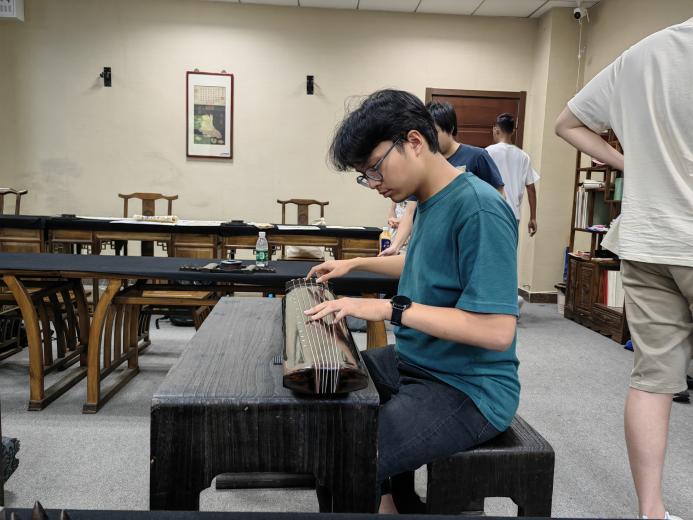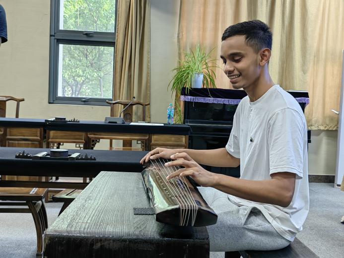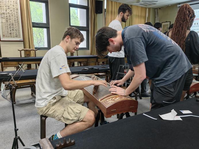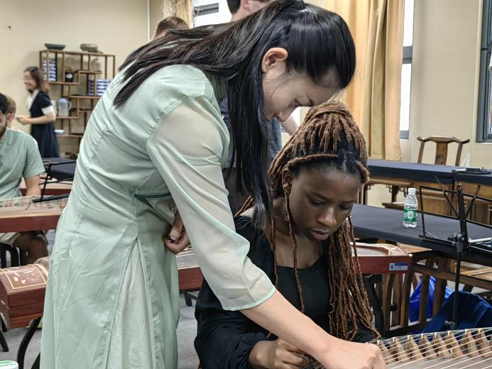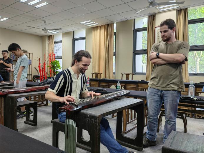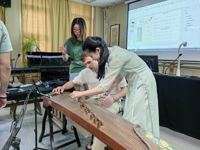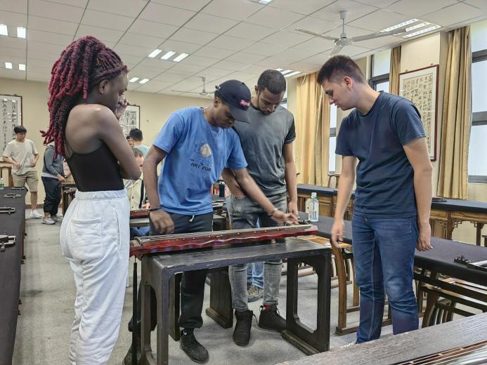 古筝与古琴的教室里,悠扬的琴音袅袅传出。老师先为留学生们讲述了乐器的历史渊源,随后指导他们如何拨弦按音。留学生们轻抚琴弦,沉浸在古典音乐的美妙世界里,感受着中国传统音乐时而激昂奔放、时而婉转低回的灵动与深沉。