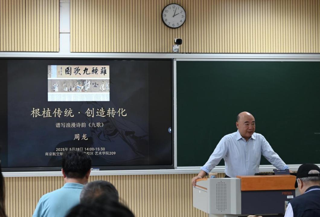 5月27日,周龙教授在天目湖校区尚德楼西附楼W203的音乐智慧教室带来题为《创作浪漫诗韵〈九歌〉》的学术讲座。他以2024年在广州星海音乐厅首演的二胡协奏曲《九歌》为核心,解析器乐重构楚辞的创作哲学,将《九歌》的文化转译策略归纳为三方面:将声乐形式改为“无词歌”,以二胡模拟人声填补词义缺失,融入竹笛与埙等民族乐器塑造云神、湘君等形象;通过西洋管弦乐与民族乐器交融,例如《少司命》选用古琴曲《神人畅》的旋律,《东君》以中胡替代男中音等方式促成跨文化对话;借助打击乐器重现楚地“娱神娱人”仪式感,在《国殇》《礼魂》联奏中实现从“神”至“人”的悲壮升华,延续祭祀精神。现场同步播放曲谱视频,磅礴交响与婉转二胡的对话令现场师生深受震撼。