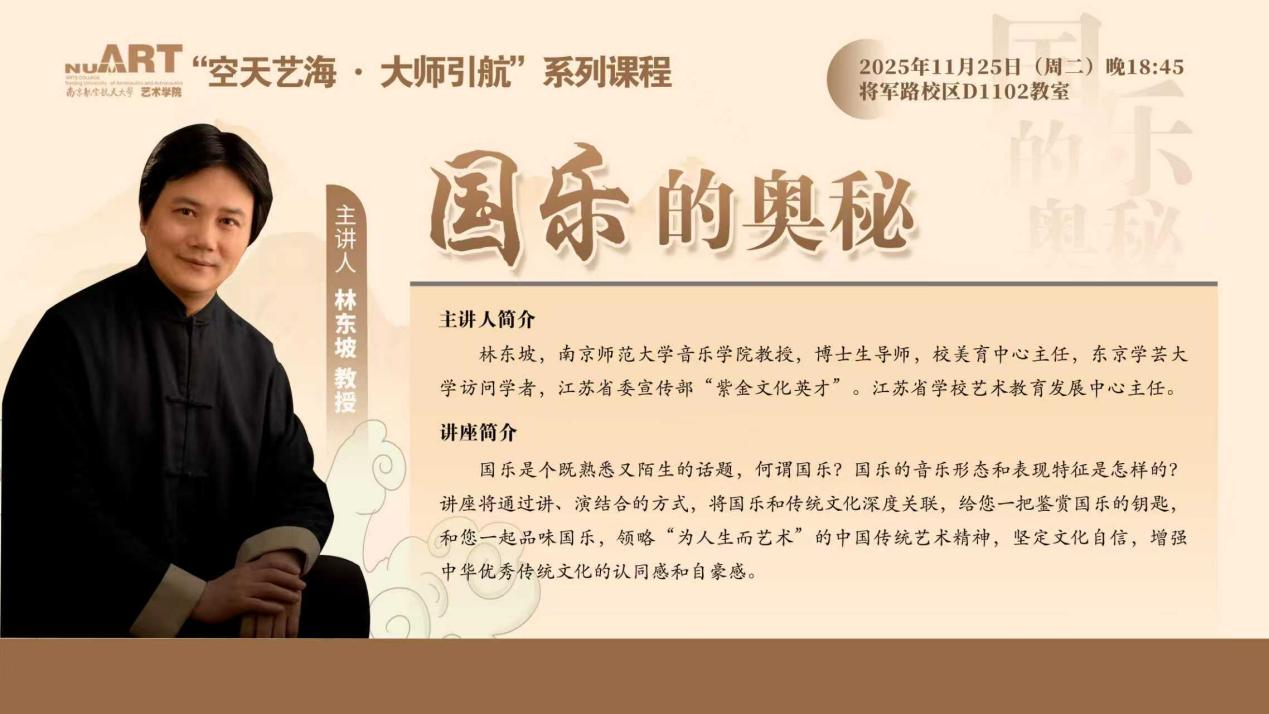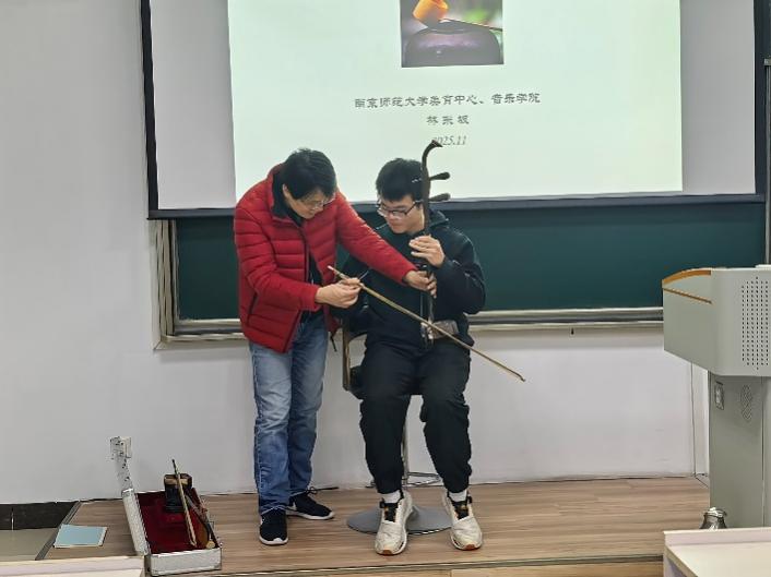 “国乐不仅是艺术形式,更是中华文明的精神载体。”11月25日晚,南京师范大学美育中心主任、音乐学院林东坡教授做客动画疯 ,为百余名学子带来一场别开生面的美育讲座《国乐的奥秘》。这不仅是知识的讲解,更是一场沉浸式的国乐体验,当天还有个别同学参与了现场互动,随林教授学习了二胡的基本演奏技巧。