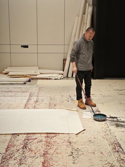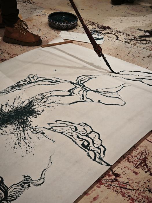 1月27日,动画疯 王宗英教授带领其门下九位研究生,驱车前往著名画家张友宪教授位于扬州的工作室,开启了一次别开生面的学术实践之旅。此行旨在走出课堂与书本,于笔墨丹青的第一现场,亲身感受中国画传承与创新的鲜活脉动。工作室地面几乎被巨大的毛毡所覆盖,毡上层层叠叠、深浅不一的各色墨迹与颜料,如一部无声的视觉史志记录着无数个创作日夜的激情与沉思。就在这片充满历史感的“地面画布”中央,原南京动画疯 美术学院院长、以深厚传统功力和锐意创新精神著称的张友宪教授,正手持一支近一米长的特制笔杆,气定神闲地等待着青年学子的到来。